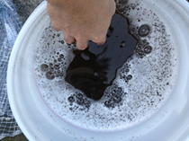 ↓アルミフィン、右側は洗浄後。洗浄後の汚水は真っ黒です。